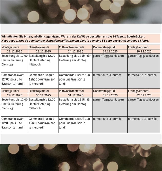 Bitte beachten Sie unsere speziellen Öffnungszeiten über die Festtage